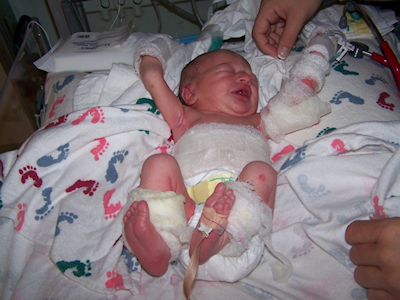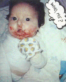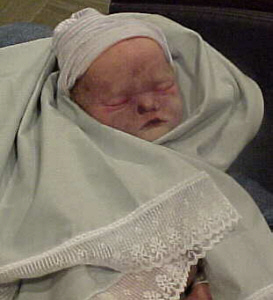 Brogan Ayre was born on March 28th, 2000. She was 7 weeks early weighing 4lb 3oz. She died on February 5th, 2001 at 10 months old from complications. She had Junctional EB with pyloric atresia. The pyloric atresia means stomach blockage. This form of EB is exeptionally rare. She put quite a fight for life in her short 10 months, and will be forever remembered and loved by all. Her mom Diane and dad Paul miss her more than words can say. The Following two poems were written for Brogan by her 11 year old cousin Amy. The first one was written when Brogan was 9 month old. The second one after her passing. ****~*** We prayed for a miracle