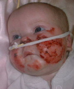 ~EB Memorials~ Junctional The generalized form of this is remarkably severe, known as gravis, Herlitz variant. This entity has bullae and large erosions occurring on mucosal surfaces. Even mild trauma can yield extensive erosions, and patients may suffer from frequent infection, sepsis, anemia, dehydration and malnutrition. Involvement may include the respiratory tree, gastrointestinal tract and genitourinary tract. Patients with the Herlitz variant rarely survive beyond their first birthday.