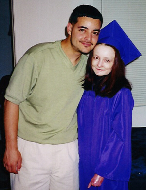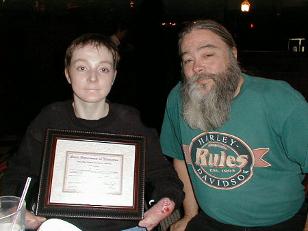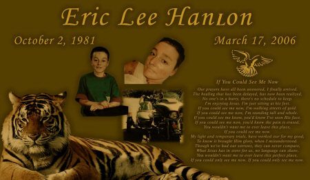 ERIC HANLON was born in Cincinnati Ohio on October 2, 1981. He was diagnosed with Recessive Dystrophic Epidermolysis Bullosa at birth. His father and mother at that time were only 18 yrs old. It did not take long for Eric's disease to make strong effects on his life. His very strong will to still be happy was what made him shine like a brand new dime. As he got older the pain and disfiguring took a lot from Eric. He spent a lot of time in and out of Cincinnati children's hospital. He still got his G.E.D. and actually worked at the hospital for a short time. He loved music, the Bengal's football team, and he loved to make people laugh. Eric encountered blood infections and skin cancer which put him on iv antibiotics. He was also on high amounts of pain meds including methadone. This caused heart arrhythmia and he soon had cardiac arrest multiple times. Eric's heart stopped beating at 24 yrs old on Saint Patrick's day. May god be with him and everyone suffering from this horrible disease. Eric had three younger sisters EB free he loved dearly, and his dog Harley. On the picture above, Eric and his dad, Eric is holding his GED.