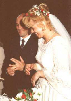 During the ceremony-Katia tried putting the ring on Max's finger but it was was swelled up, so he finished the job. The priest said something funny and that is why they are laughing: "It had such a hard time going in, we know it won't get out anymore!!!"